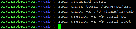 sudo chgrp tosil /home/pi/usb - tosil 이라는 그룹이 /home/pi/usb 디렉토리의 권한을 가지도록 변경해요