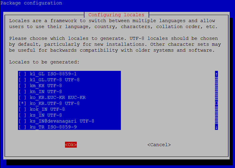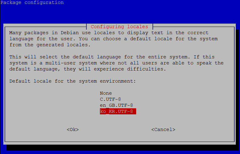 ko_KR-UTF-8 을 기본으로 선택하고 탭키 눌러 OK