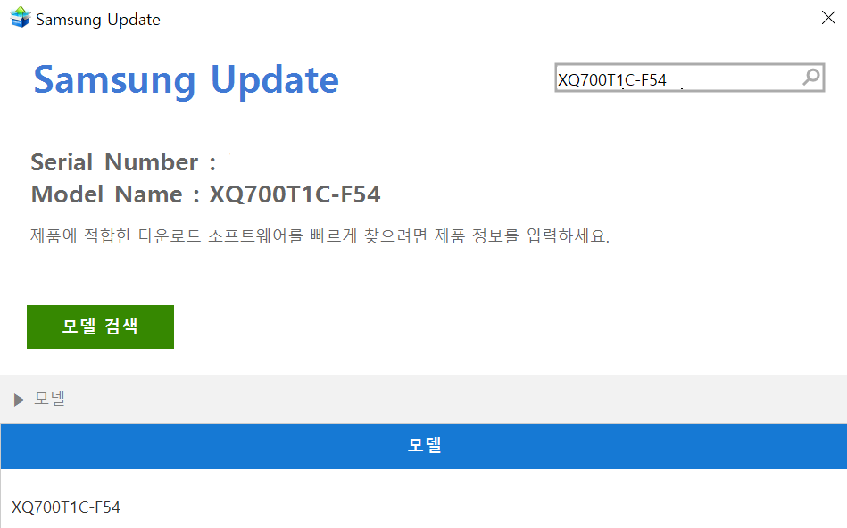 업데이트 프로그램을 다운받아 설치 한 후, 약관에 동의하면 모델명을 검색하는 창이 나옵니다.
