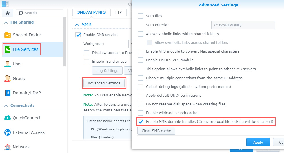 Enable SMB durable handles 체크를 지우고 (사진에는 체크가 되어있네요) apply (적용) 버튼을 눌러주세요