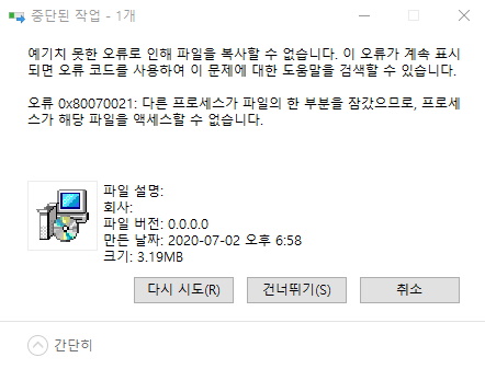 0x80070021 은 파일복사할때 파일의 이름과 크기정도만 전송한 후 실제 데이터 복사가 시작되면 해당 파일의 내용을 쓰지 못할때 일어나는 에러입니다. 즉 NAS 쪽 문제라는 뜻이에요.