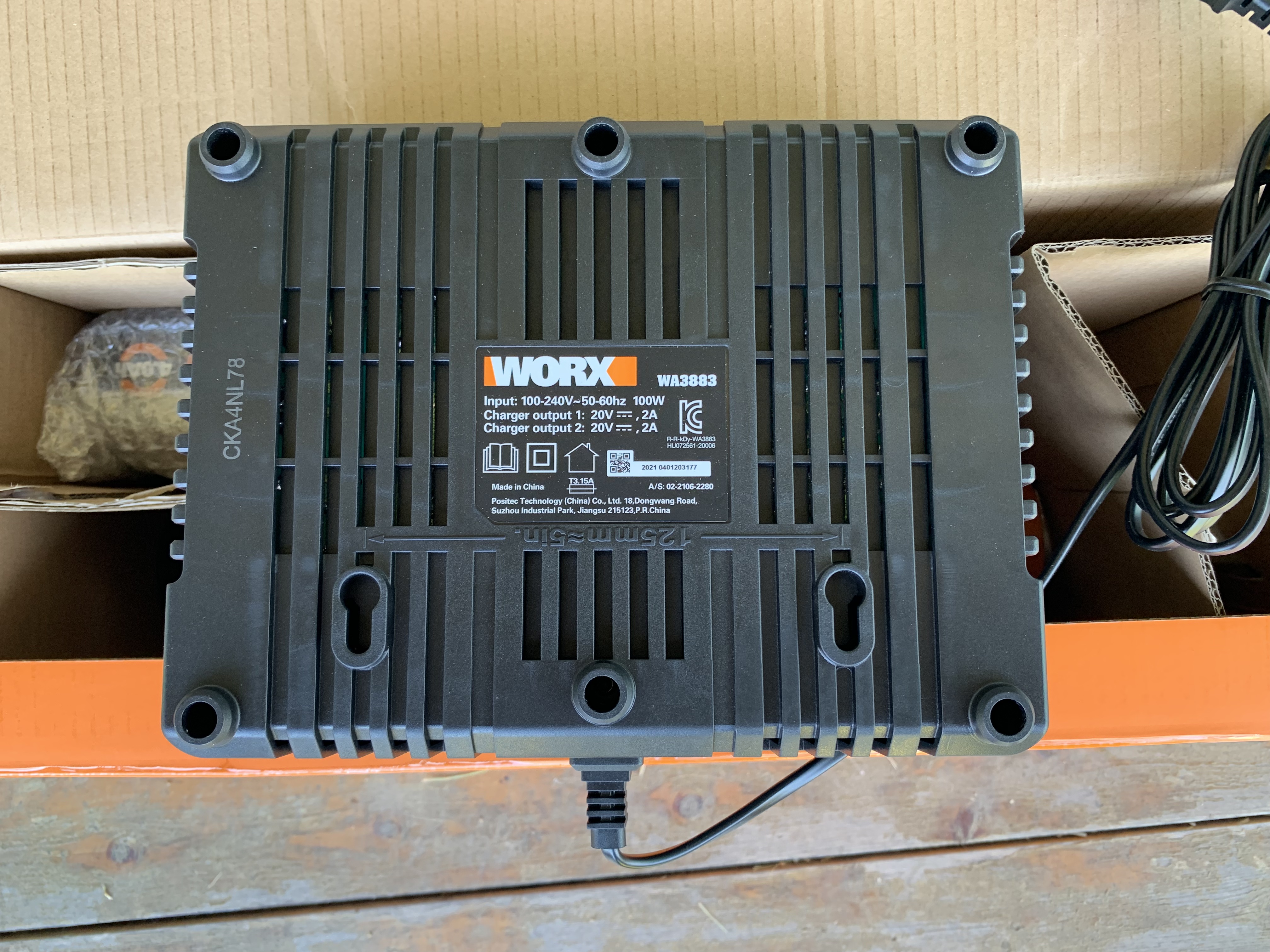 충전기는 WA3878 배터리 2개를 동시에 충전 가능.