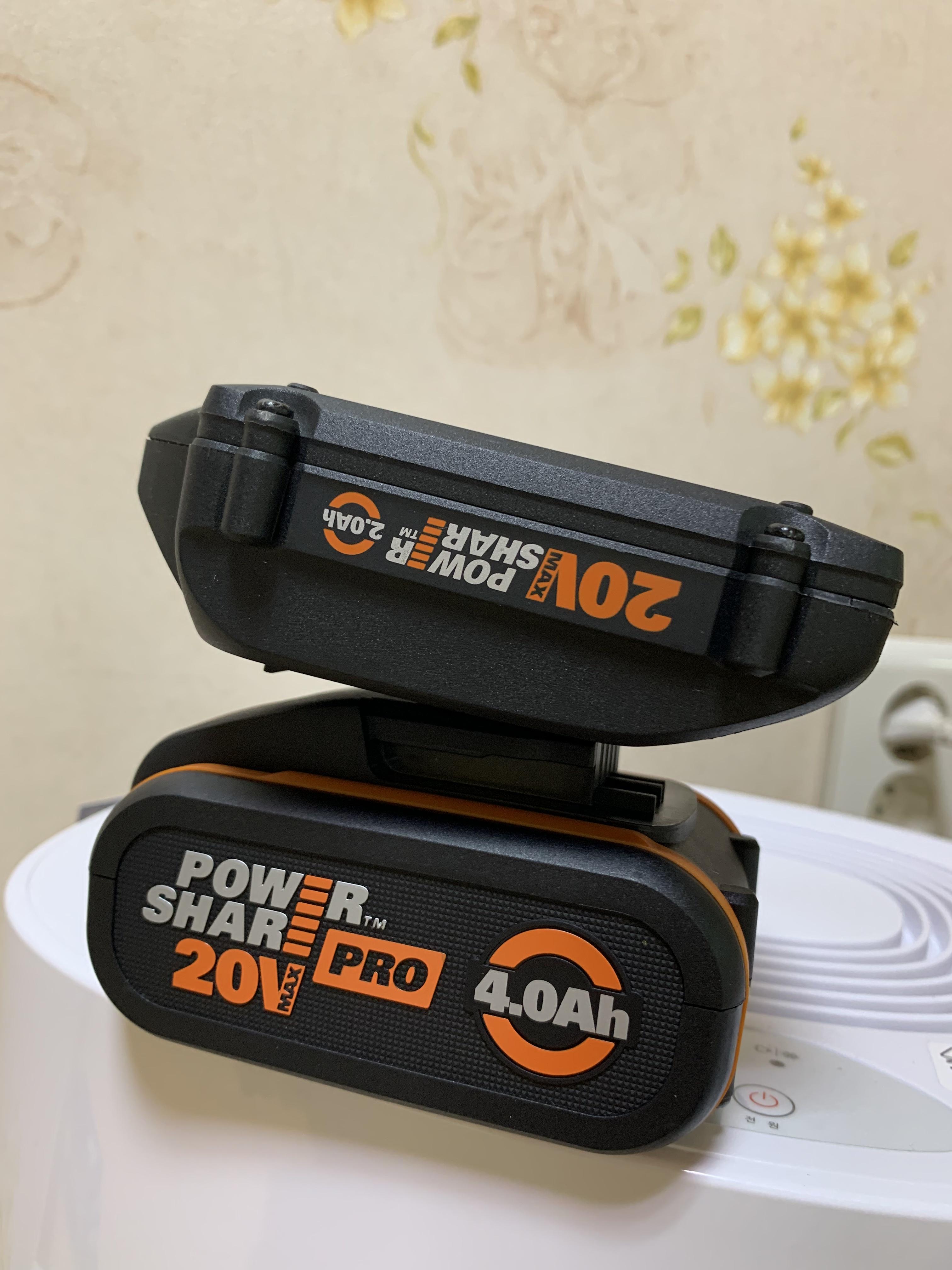 배터리가 호환되나 했는데 안되더라고요. WORX의 20볼트 배터리는 라인업이 3개인데, 하나는 그린으로 중소형 보급형 기기에 쓰는거고, 오렌지가 두개인데 하나는 예초기에 쓰는 6핀, 다른 하나는 용량에 몰빵한 4핀 프로 라인업입니다.