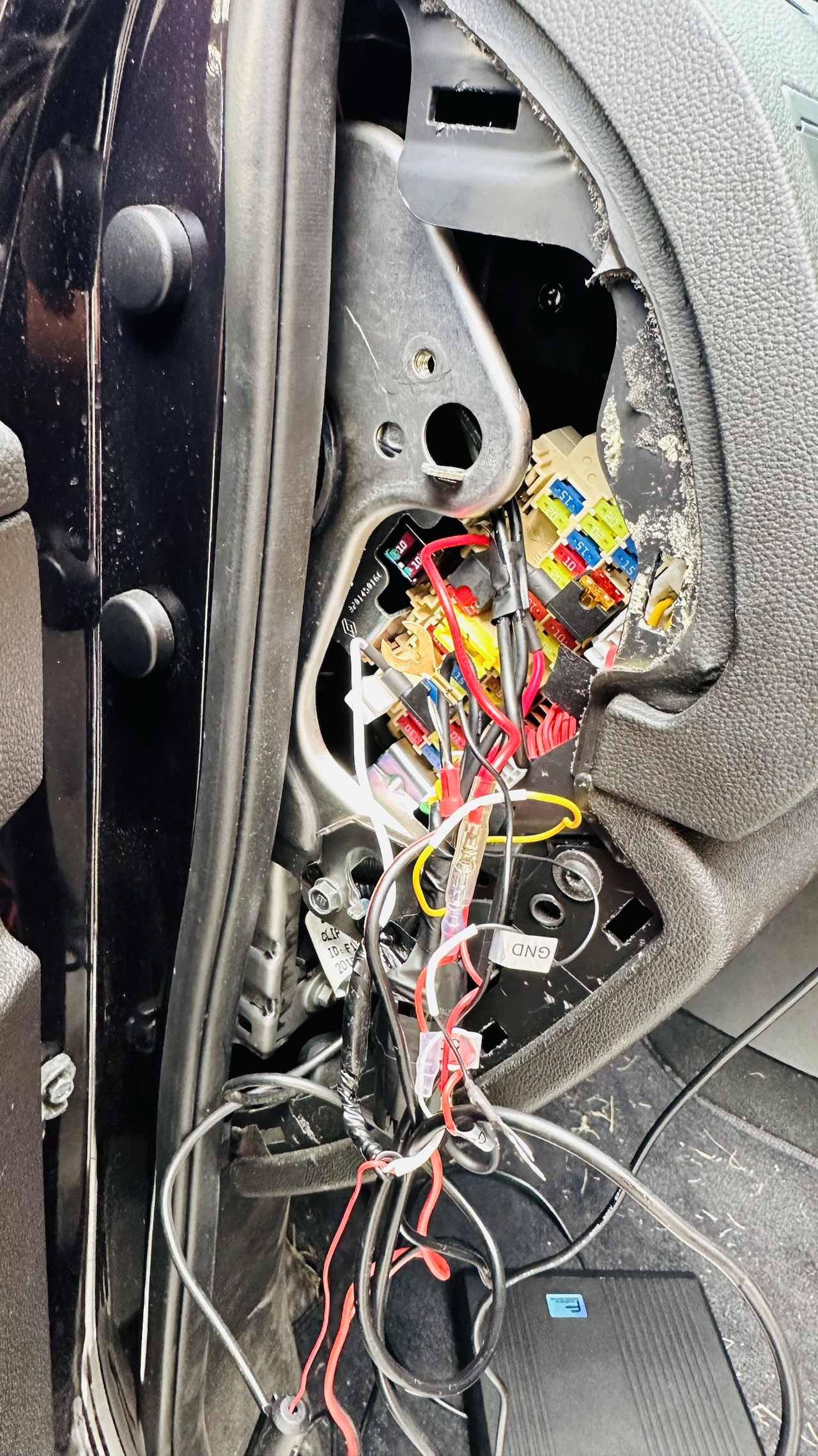 파인파워 배선이 입력부 3가닥, 출력부 3가닥(이건 기본 피복 되어있음) 총 4가닥인데, 은근 부피가 되서 운전석 킥킹쪽으로 배선을 빼기도 약간 애매하다. 그래서 계기판 아래쪽 밑으로 기어들어가서 케이블타이와 벨크로 테이프를 총 동원해서 붙어버렸다.